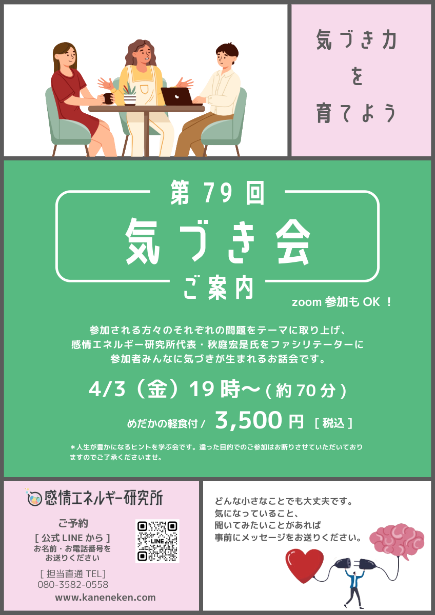 【チケット】 気づき会 ¥3,500 (税込) 【チケット】 気づき会個 お買い物カゴに追加 カテゴリー: イベント タグ: クレジットカード支払いのみ 説明 説明 参加される方々のそれぞれの問題をテーマに取り上げ、 感情エネルギー研究所代表・秋庭宏是氏をファシリテーターに参加者みんなに気づきが生まれるお話会です。